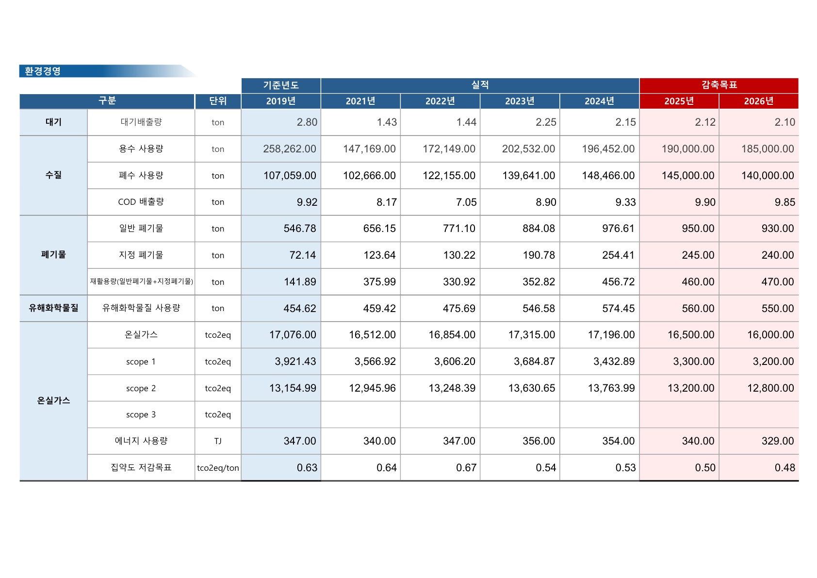 2024년 환경경영 성과지표 및 2025년 감축목표