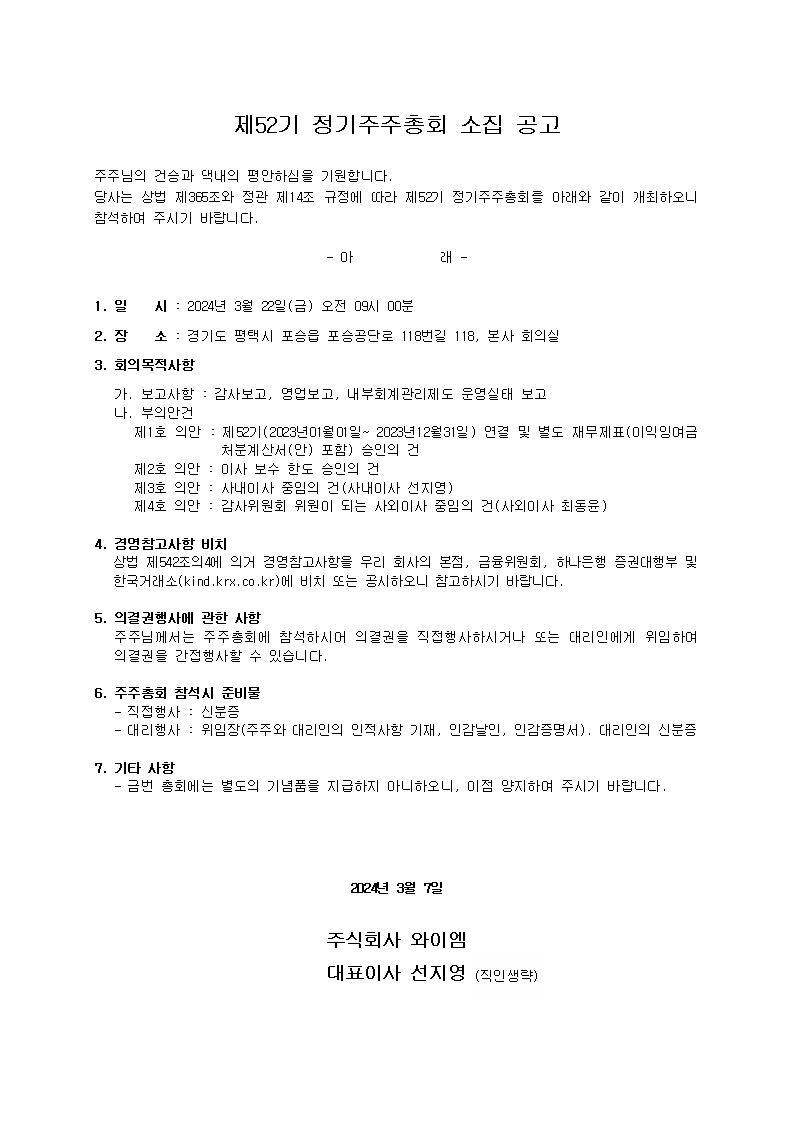 제52기 정기주주총회 소집 공고